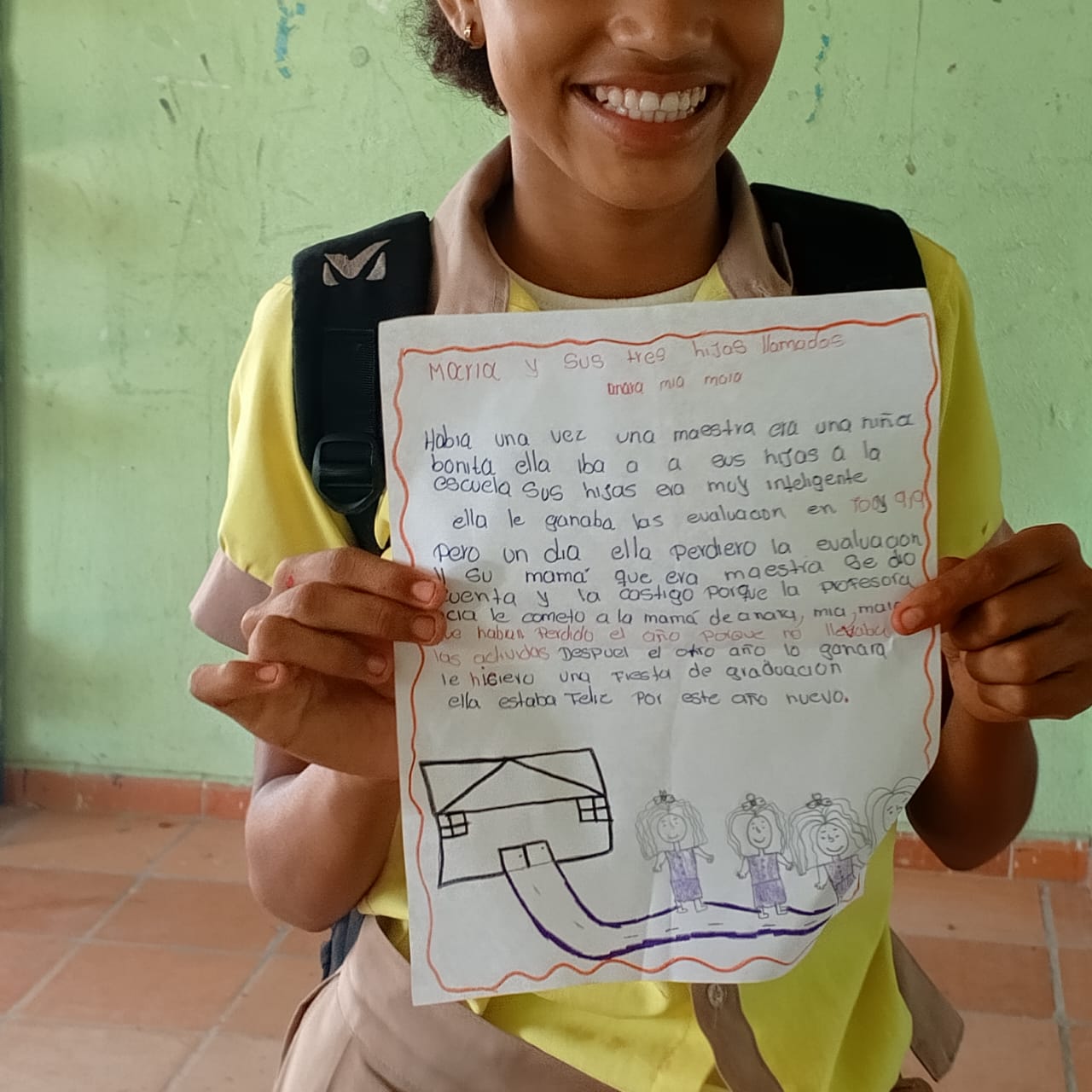 • (10 minutos) Escritura: Los grupos escriben su relato en la hoja grande. Deben asegurarse de que todos aporten a la historia.